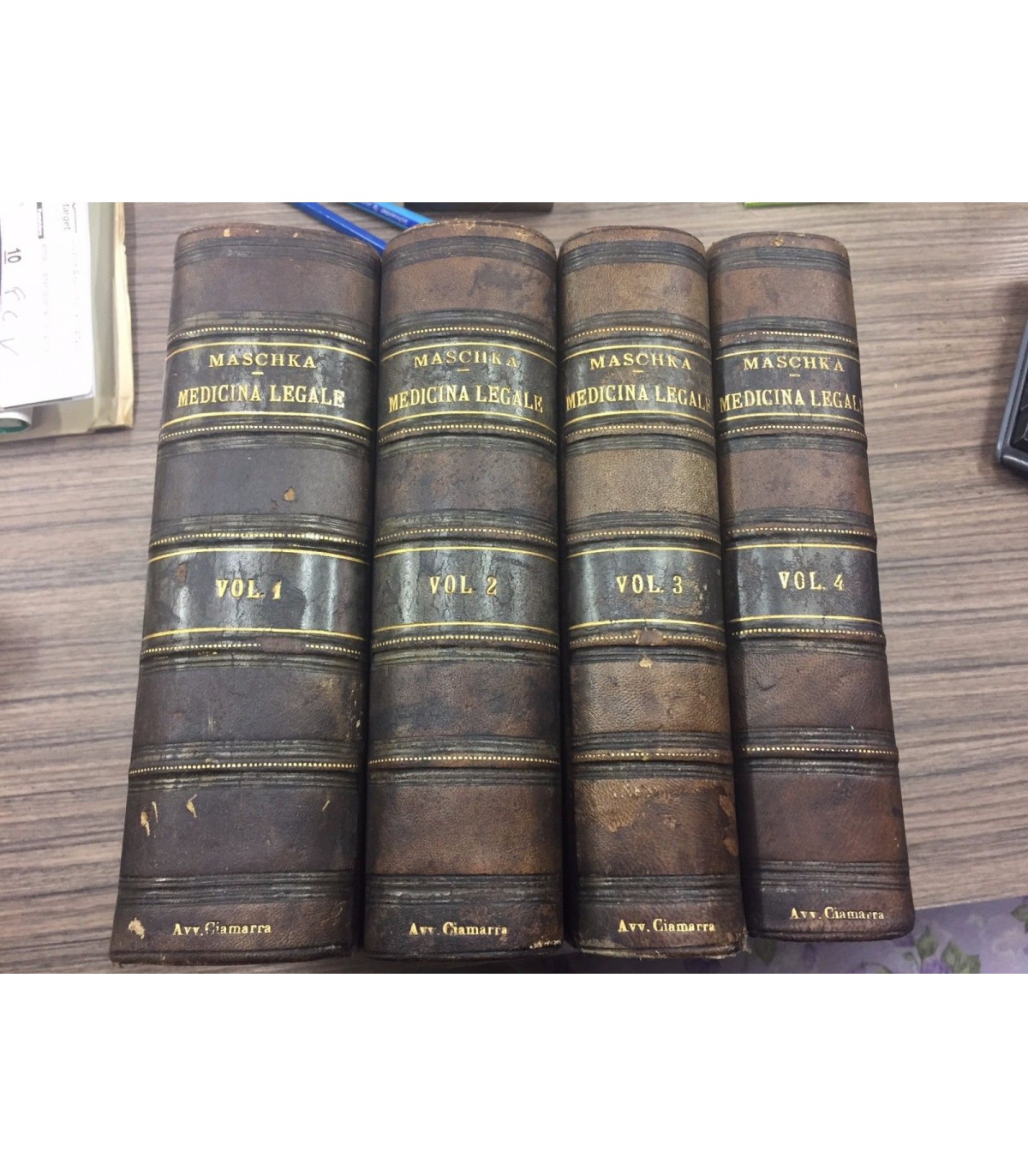 4 voll. Sviluppo storico della medicina legale - Compito del medico legale nell'eseguire le ricerche e nel dare il suo parere - dottrina delle lezioni violente sotto il punto di vista medico legale - Produzione delle lezioni violente meocaniche con speciale riguardo alle escoriazioni contusioni, ferite da taglio, da fendente, lacere e da arma a fuoco - lesioni violente dell'orecchio sotto il rapporto medico legale - le cicatrici sotto il rapporto medico legale - risposta alla domanda .... Tradotto dai dottori Raffaele Antoni e Meyer Vincenzo. Napoli. Jovene 1893, 8°, pp. 1178+878+806+796, con tavole a colori f.t. Leg. mz pelle coeva, tit. in oro al dorso con spellature. Bruniture ma buon esemplare.