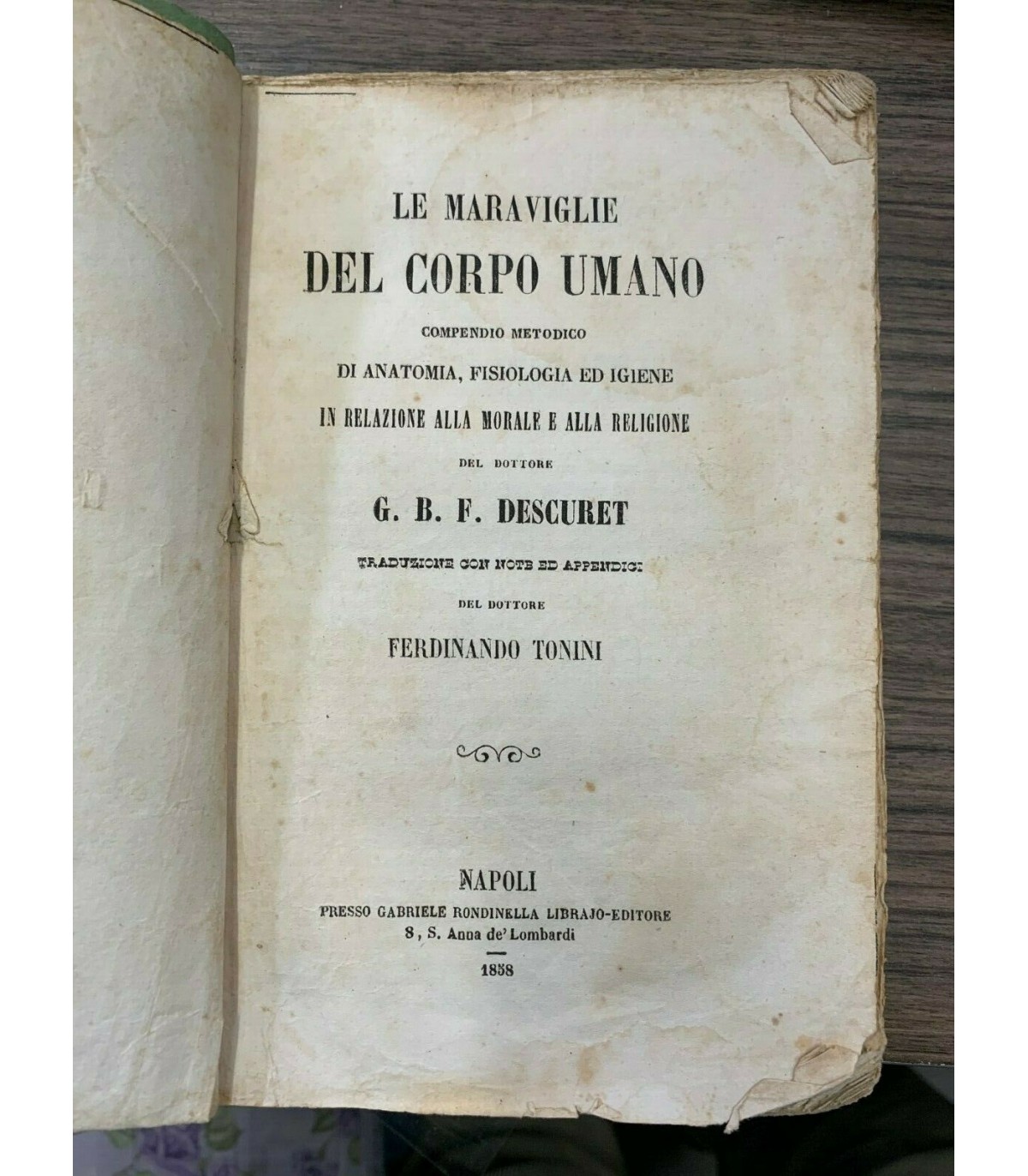 Compendio Metodologico di anatomia, fisiologia ed igiene in relazione alla morale e alla religione. Traduzione con note ed appendice col Ferdinando Tonini. Napoli. Rondinella 1858, 16°, pp. 490. Piccolo strappo alla prima pagina senza perdita di testo. Bruniture. Bross. muta coeva. Segni del tempo.