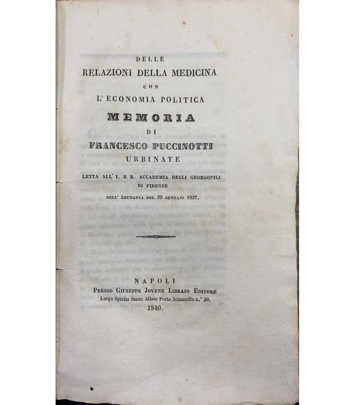 Letta all'I.E.R. Accademia degli georgofili di Firenze. Napoli. Jovene 1840, 16°, pp. 28. Bross. Coeva muta.