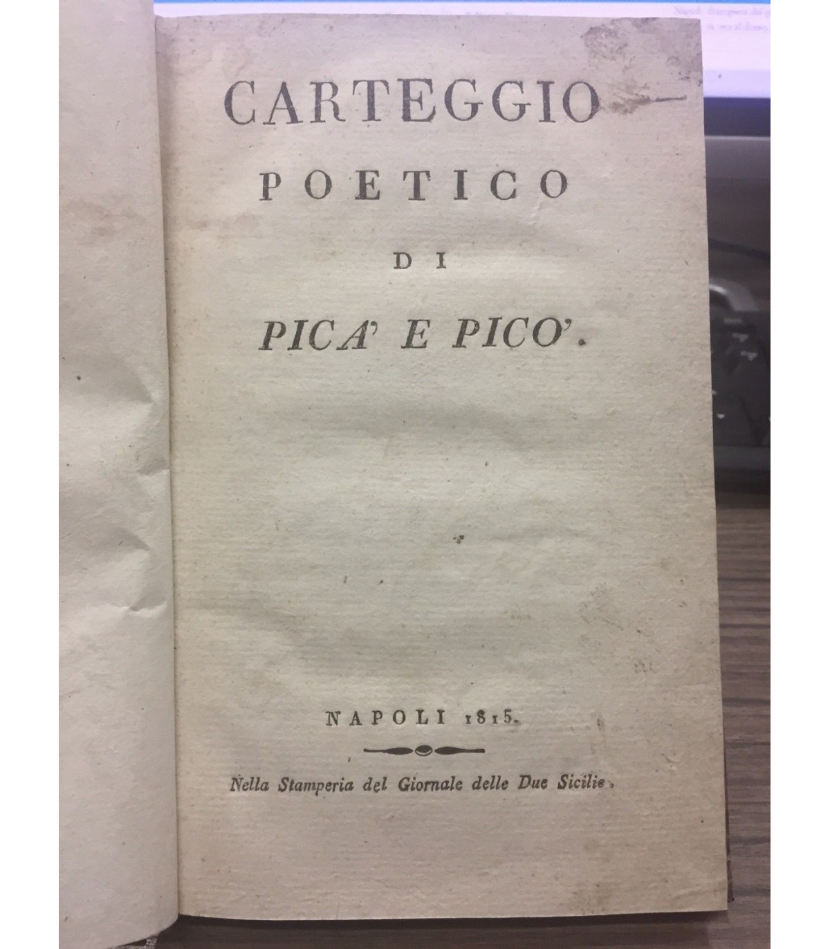 Napoli. Stamperia del giornale delle Due Sicilie 1815, 16°, pp. 104. Leg. Mz tela, tit. in oro al dorso, mancanze ai piatti. Segni del tempo.