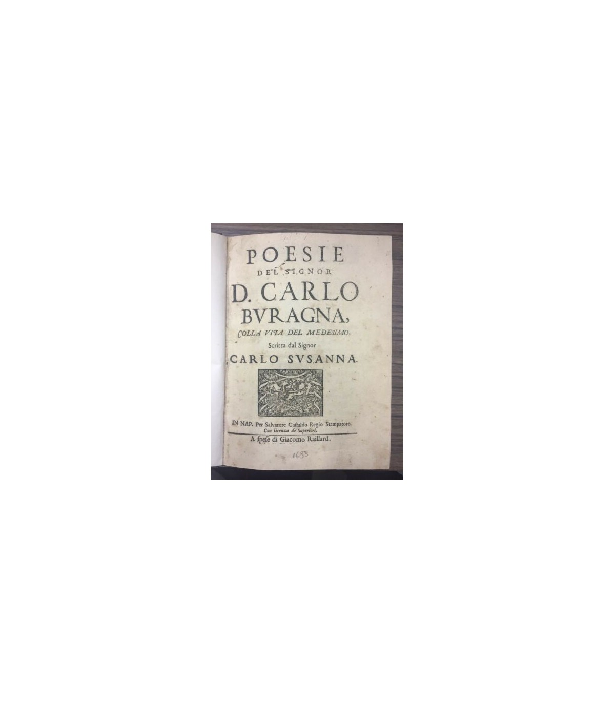 Colla vita del medesimo scritta dal Signor Carlo Susanna. Napoli. Per Salvatore Castaldo Regio Stampatore. A spese di Giacomo Raillard (1683), 16°, pp. 8nn+118+24nn. Capilettere e finalini incisi. Bella marca tipografica al frontespizio. Leg. Mz tela, tit. in oro. al dorso. Bruniture ma buon esemplare.