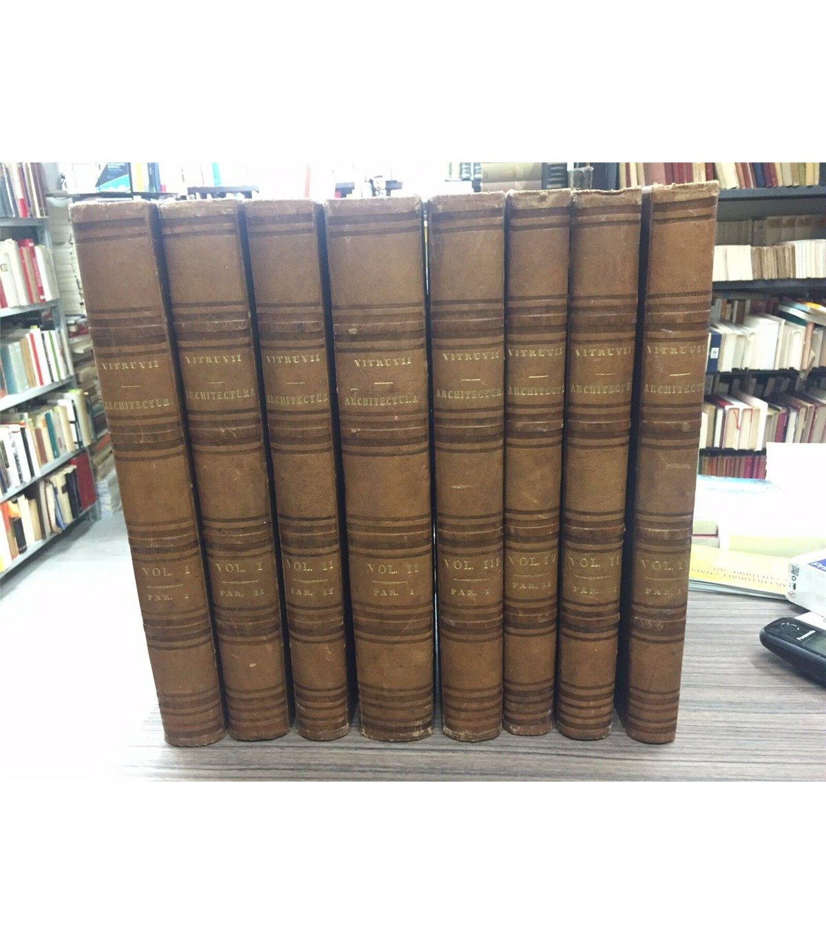 Textu ex recensione codicum emendato cum exercitationibus notisquenovissimis Joannis Poleni et commentariis variorum additis nunc, primum studiis Simonis Stratico. Opera completa di 4 volumi in 8 tomi. Utini. Apud Frates Mattiuzzi 1825, in 4°, pp. XXX+316+101+222+250+184+283+286+235+144, con 143 tavole e tabelle f.t. ripiegate e di cui una raffigura un ritratto. Esemplare a margini ampi, bruniture ma buono stato di conservazione. Splendida legatura in mezza pelle coeva, tit. in oro al dorso con segni del tempo marginali e piccole mancanze. Riccardi I, 620 ‘grandiosa opera’. Brunet V. 1328.