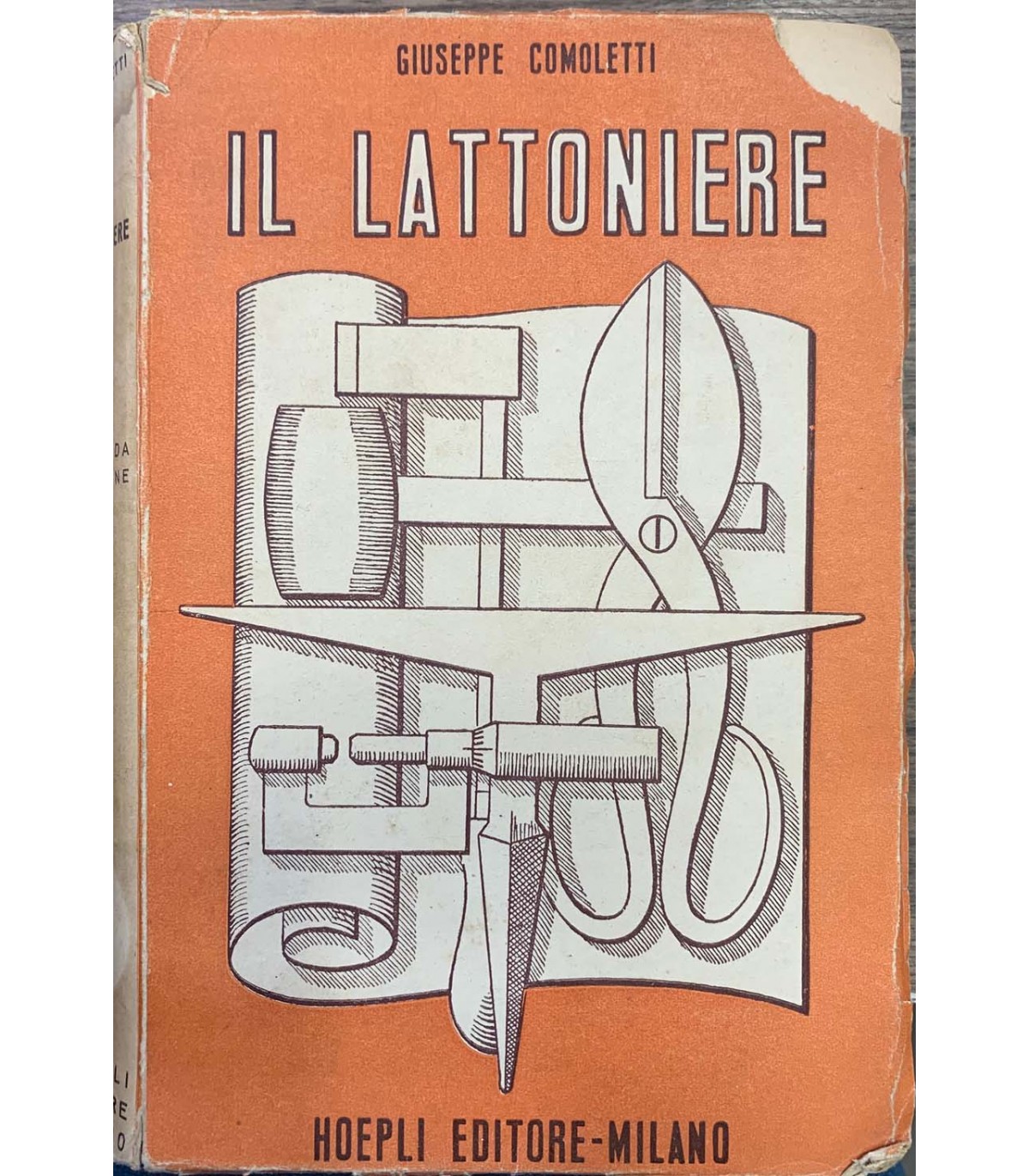 La pratica lavorazione dei metalli in lastra in tutte le sue applicazioni, Seconda edizione ampliata. 575 figure nel testo 36 tavole geometriche e 8 illustrazioni. Milano. Hoepli 1949, 16°, pp. 596. Manca la prima pagina bianza. Bross. Edit. Mancanza all'angolo superiore dorso spaccato.