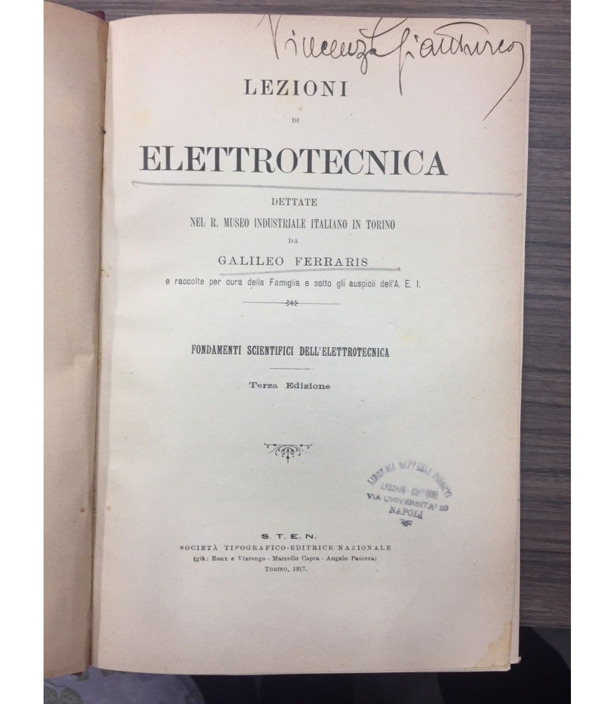 Dettate nel R. Museo Industriale italiano in Torino da Galileo Ferraris e raccolte per cura della Famiglia e sotto gli auspici dell'A. Fondamenti scientifici dell'elettrotecnica. Milano. Sten 1917, 8°, pp. 432. Tracce di studio marginali ma buon esemplare. Firma d'app. al frontespizio. Leg. mz tela, tit. al dorso. Segni del tempo.