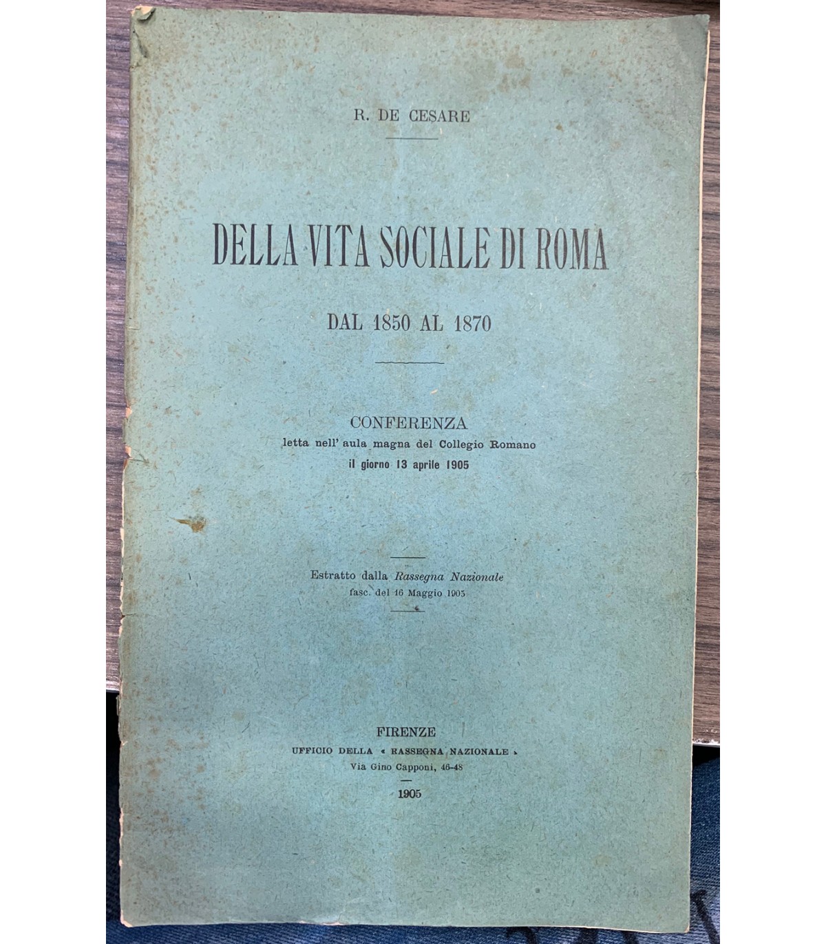Conferenza letta nell'aula magna del Collegio Romano il giorno 13 aprile 905. Estratto dalla Rassegna Nazionale. Firenze. 1905, 16°, pp. 22. Bross. Dorso con mancanze.
